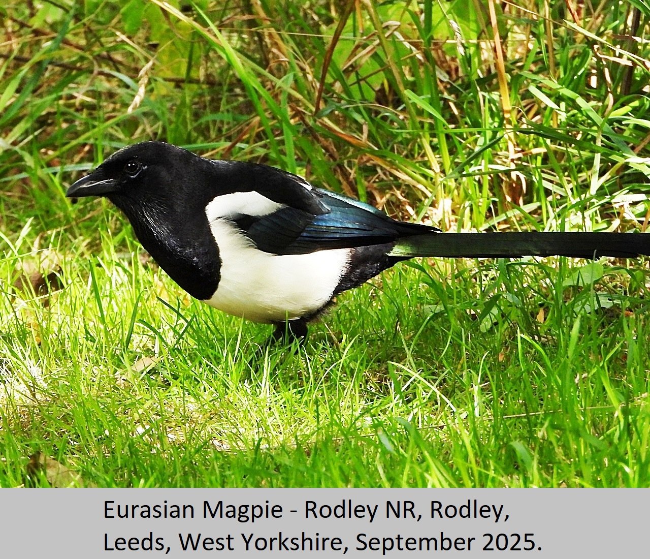 Eurasian Magpie: UK Status: Resident. Habitat: This is found is found in many habitat types including, gardens, parks, tall hedgerows, woods and heaths. Breeding: This bird seems to require fairly tall dense thorny, or prickly shrubs to nest in. They build a nest of sticks and twigs, with a domed roof over the top. There is an entrance hole on one side of the nest, Eggs number five to eight per clutch, and are pale blue heavily streaked and mottled with darker brown. Comment: This beautiful largish black and white bird, with it's bluish purple iridescent sheen is fairly common throughout the British Isles. |