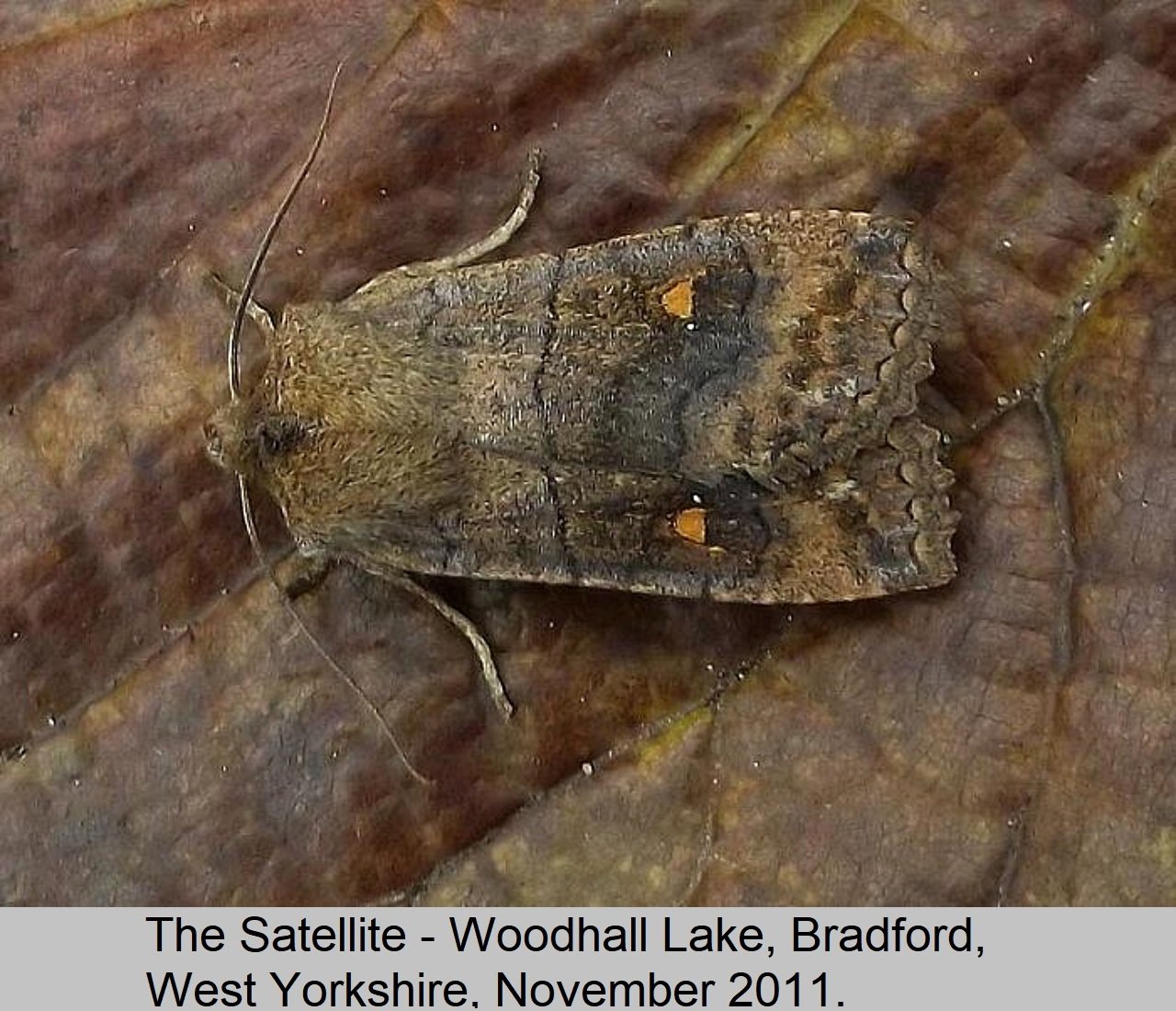 Status: Resident in UK. Wing Span: 40mm to 48mm. Flight Period: September until November, again in April after hibernation. Habitat: Woodland, parks, feeds at Sallow and Ivy Blossom, and comes to light. Comment: Common and wide spread overt England, Wales, and Ireland. Scarce in Scotland. |