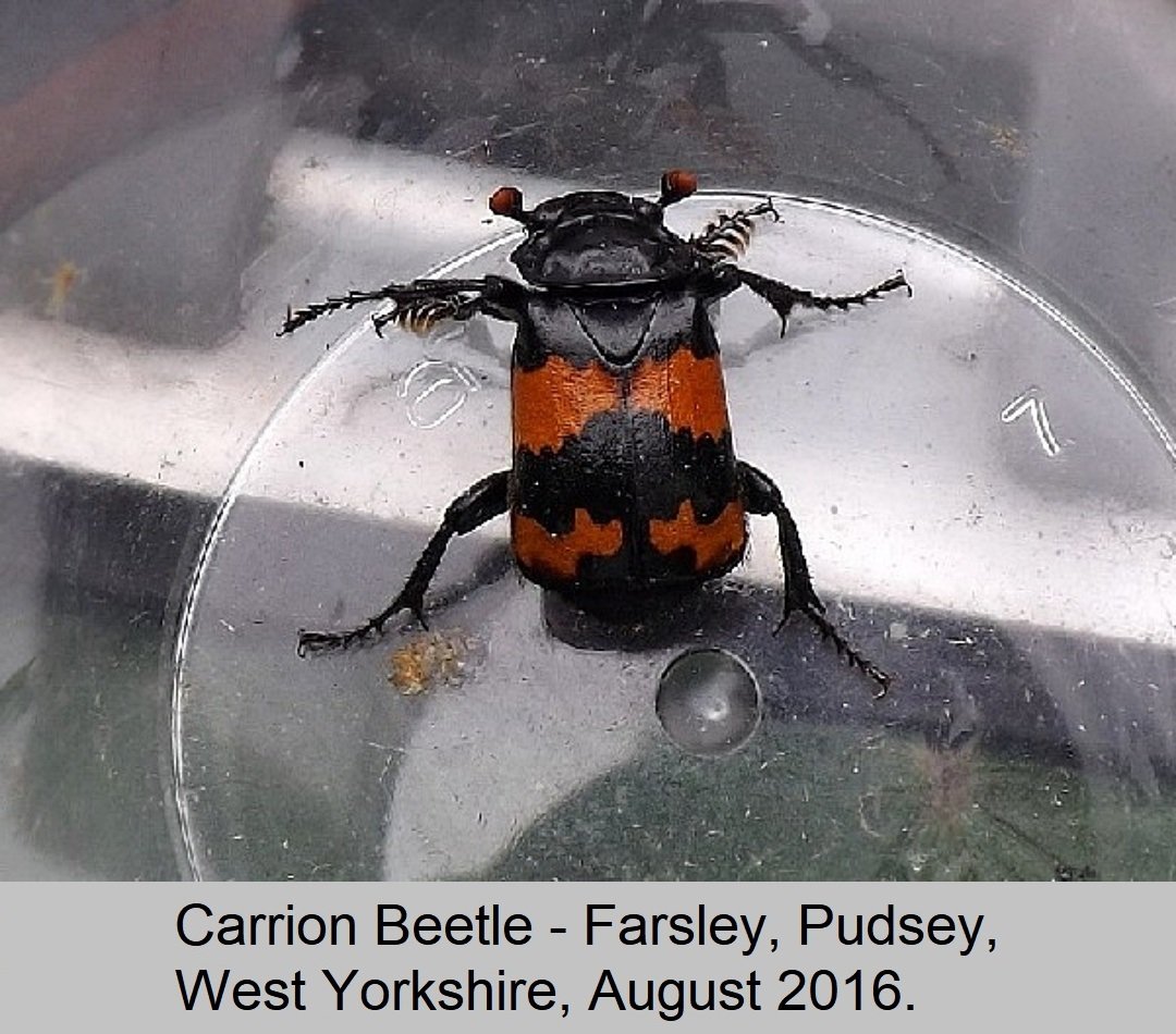 Status: Resident in UK. When Around: May until September. Habitat: Adult beetles and the larvae feed on dead rodents and birds. The adult beetles locate dead animals and birds, and then bury them in the ground by excavating underneath the carcass. Both parents feed the grubs on partially digested remains of the dead carcass. Comment: Wide spread over the UK. |