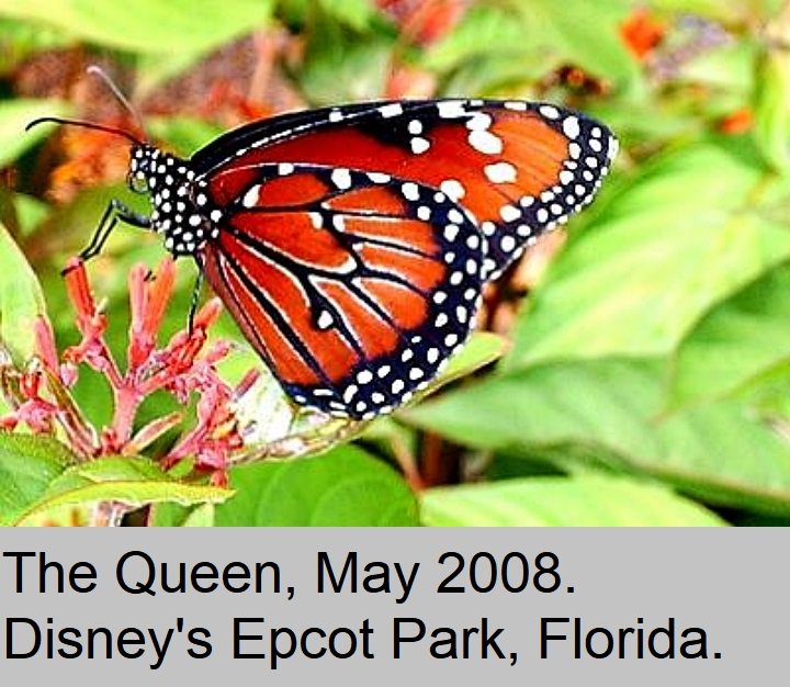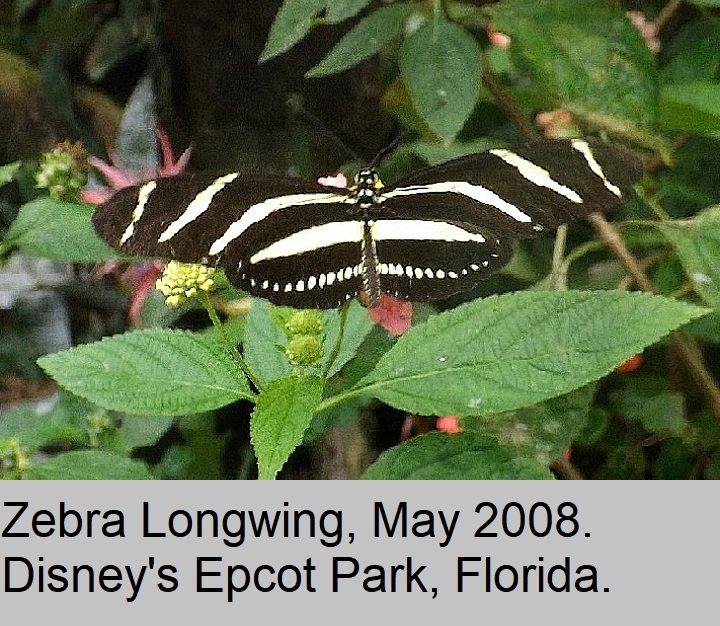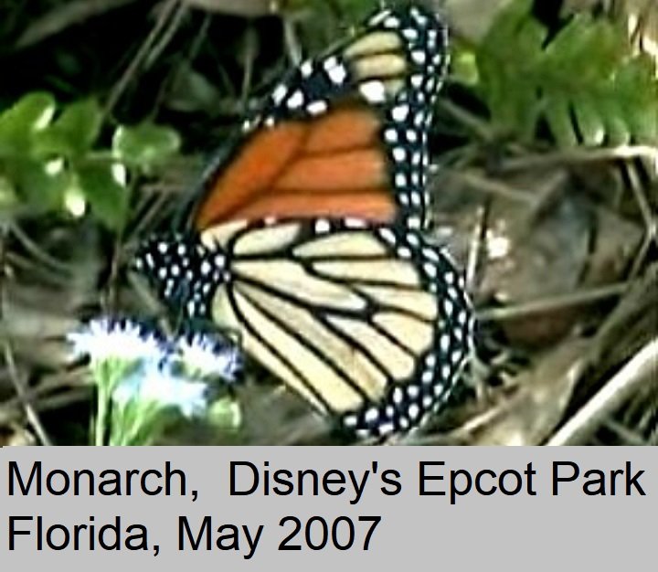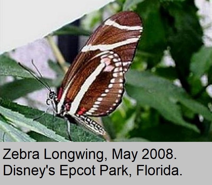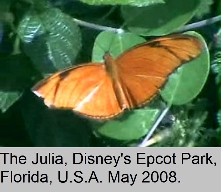 Florida is a great holiday for anyone interested in fantastic rides and wildlife. Anyone from the age of about five years would most likely enjoy being there. Most of the theme parks are landscaped with various plants and tree's. There are also wilder areas, and butterflies, lizards and other wildlife is common in the parks. Even the car parks are a wildlife treasure trove, I found my first katydid in Epcot's car park. I was more than a bit surprised on my first visit in 2004, to find some of the parks were so picturesque. Lots of large colourful butterflies to be seen, and many species. |