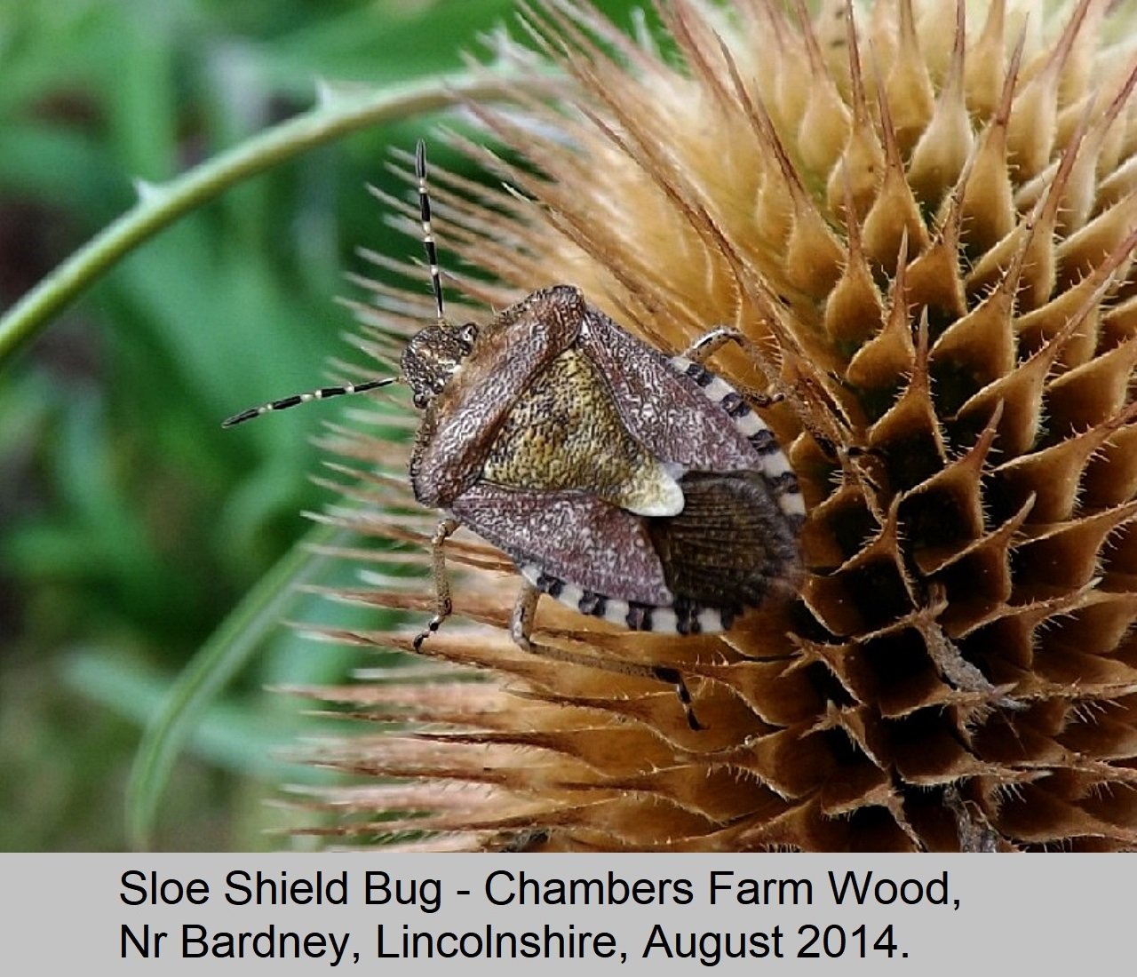 Status: Resident in UK. Length: 11mm to 13mm. When Around: All the year around. Habitat: They are plentiful where Blackthorn and Rosaceous shrubs grow, especially on the fringes of woods and in hedgerows. Comment: The Sloe Bug is and widely distributed and common throughout Britain, becoming scarcer in the north. |