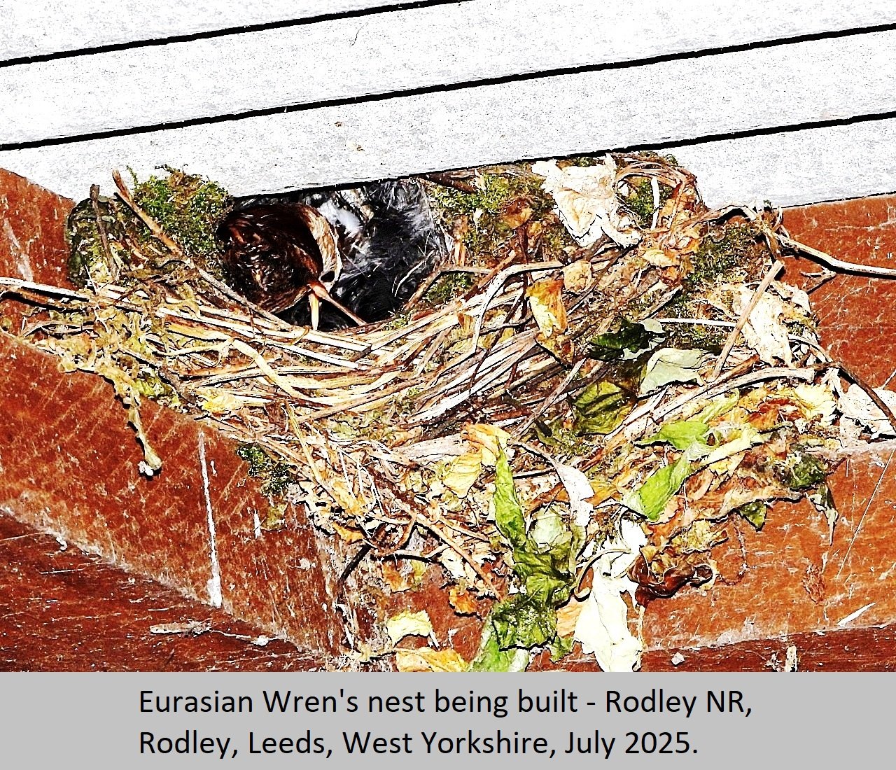Eurasian Wren: UK Status: Native to the UK. Habitat: This bird if found almost any where in a wide variety of habitats. It is Britain's most common bird, and often visits, or nests in domestic gardens. The Wren feeds mainly on insects, and other invertibrates. Breeding: This species builds a rounded domed nest, with an entrance hole in the side. Nests can be placed in a variety of situations, generally a few feet up off the ground. Sites range from thick hedges, ivy thickets, holes in walls, nest boxes and in buildings where there is easy access to the nest. I have twice seen wrens nesting in bird hides on nature reserves, like the one at Rodley in the picture on the right. Nests are constructed from thin twigs, leaves and grass woven together, and lined with lichen, moss, hair and feathers. Males build several nests which are not lined until his mate chooses one. An average clutch of eggs is about five or six, but can be as few as three, or as many as eleven. Eggs a very small, white with reddish brown speckles. Comment: This bird is often shy and skulking, it doesn't usually sit still for long in one place, and as such can be difficult to observe.