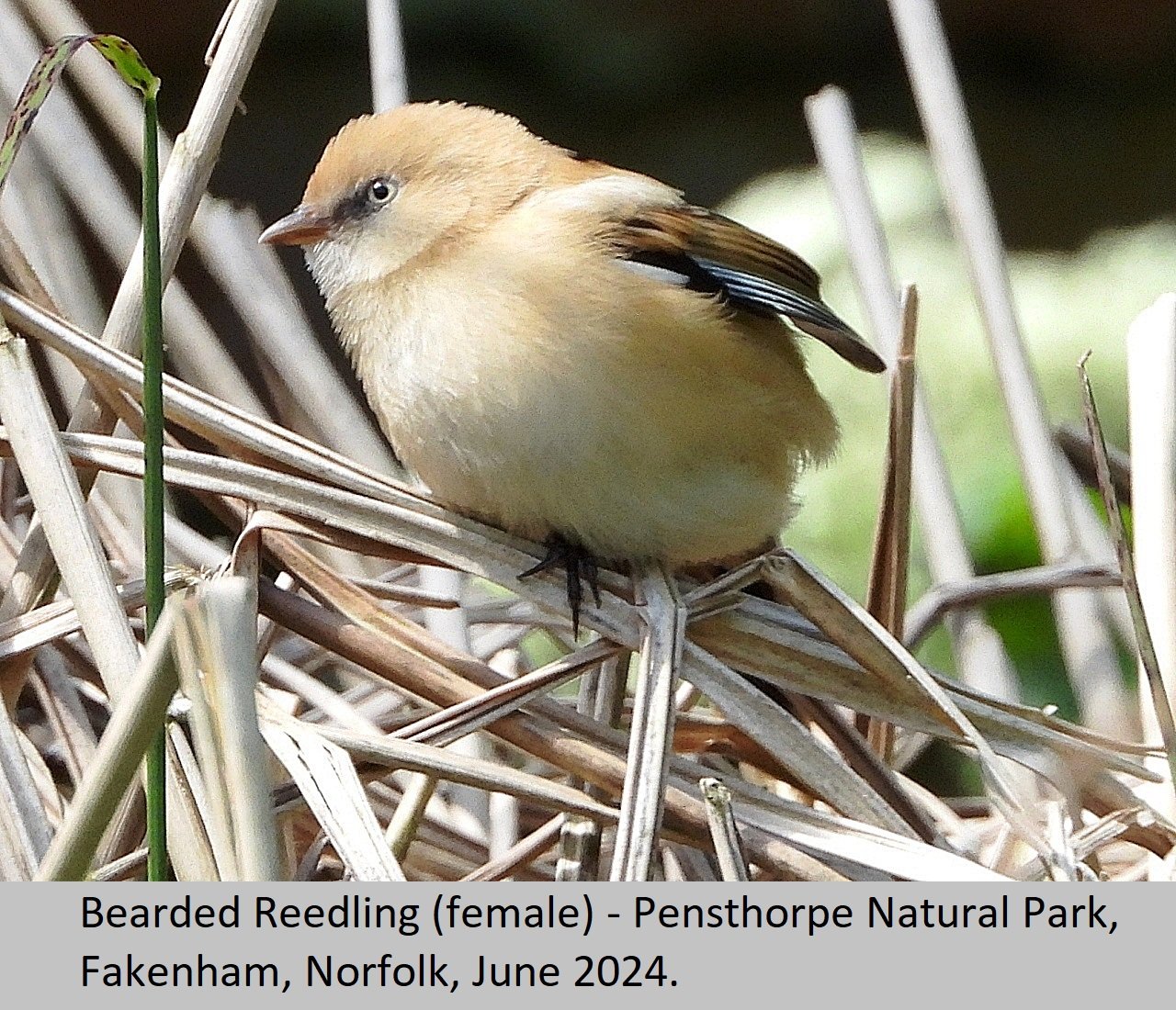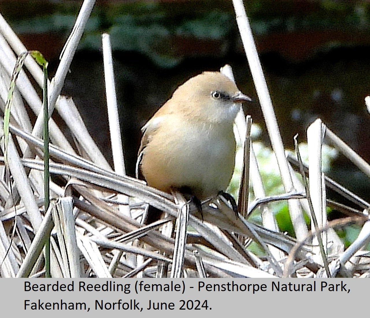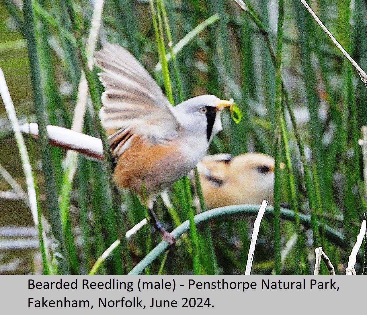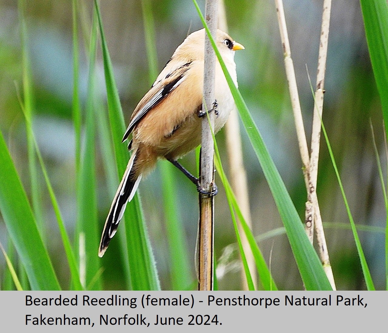 Bearded Reedling: UK Status: Resident, with about seven hundred breeding pairs in the UK. More can be seen in spring and autumn when some birds from Europe are migrating. Habitat: This bird inhabits extensive and mainly coastal reed beds during the breeding season, around the waters edge, as part of it's name suggests. Sometimes a few birds are spotted elsewhere during the late autumn, through to early spring. Breeding: Nests are placed well inside reed beds, quite low down and are interwoven with the reeds as support. They are constructed from reeds for the outer shell, the cup inside is lined with dry grasses. The normally lay four eggs, which are of an olive brown, with blackish brown blotches and squiggles, mainly toward the broader end. Comment: The Bearded Reedling is also known as the Bearded Tit, the male and female birds are sexually dimorphic, as you can see. They are not particularly common, at least partly due to the loss of wetlands over the last few decades. Most observers only get fleeting glimpses of these birds. They deep within the reed bed, perching on top of the reeds for mere seconds at time. They are a devil to photograph, as my pictures will confirm.