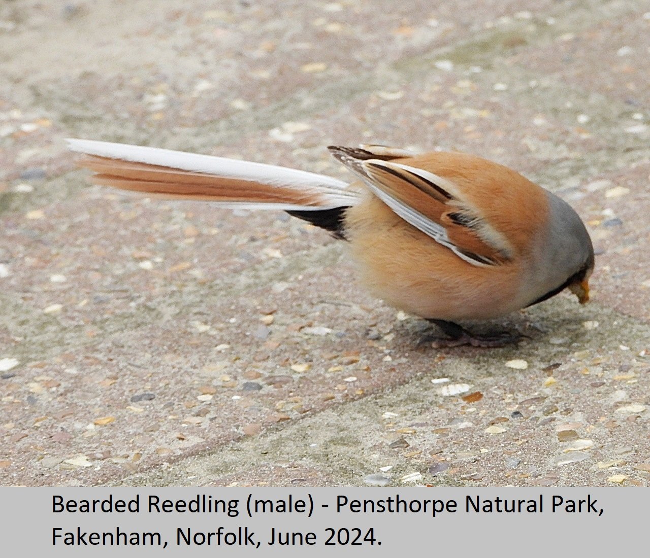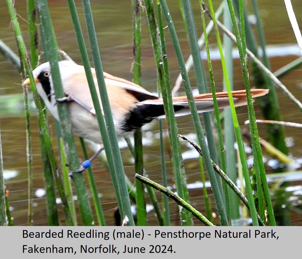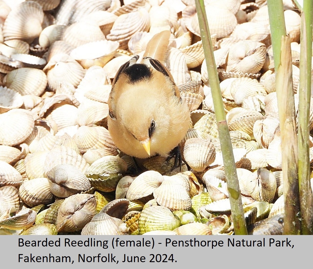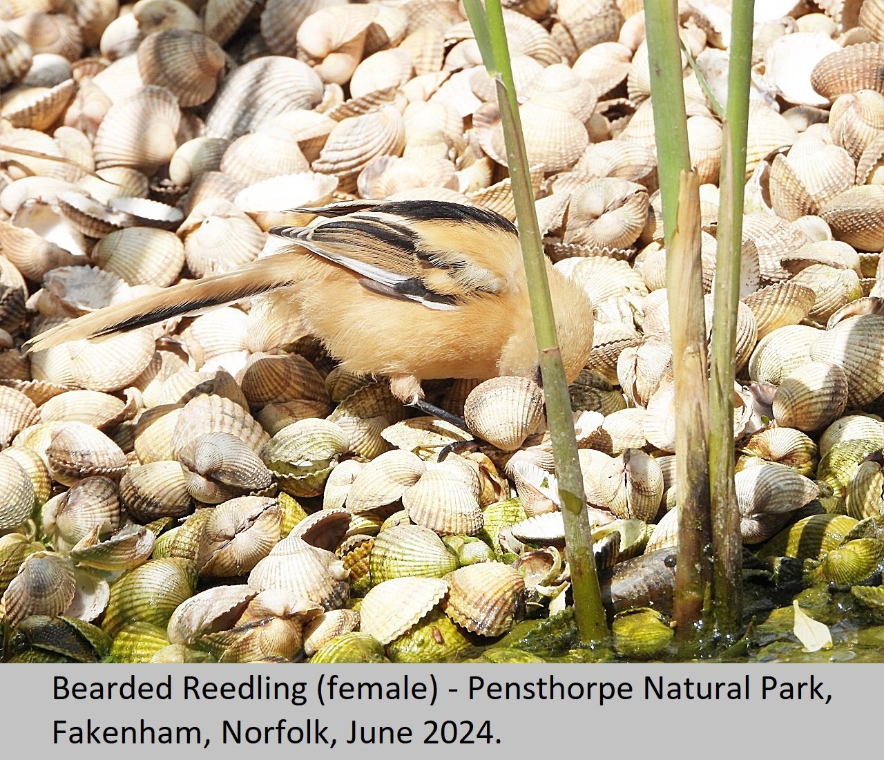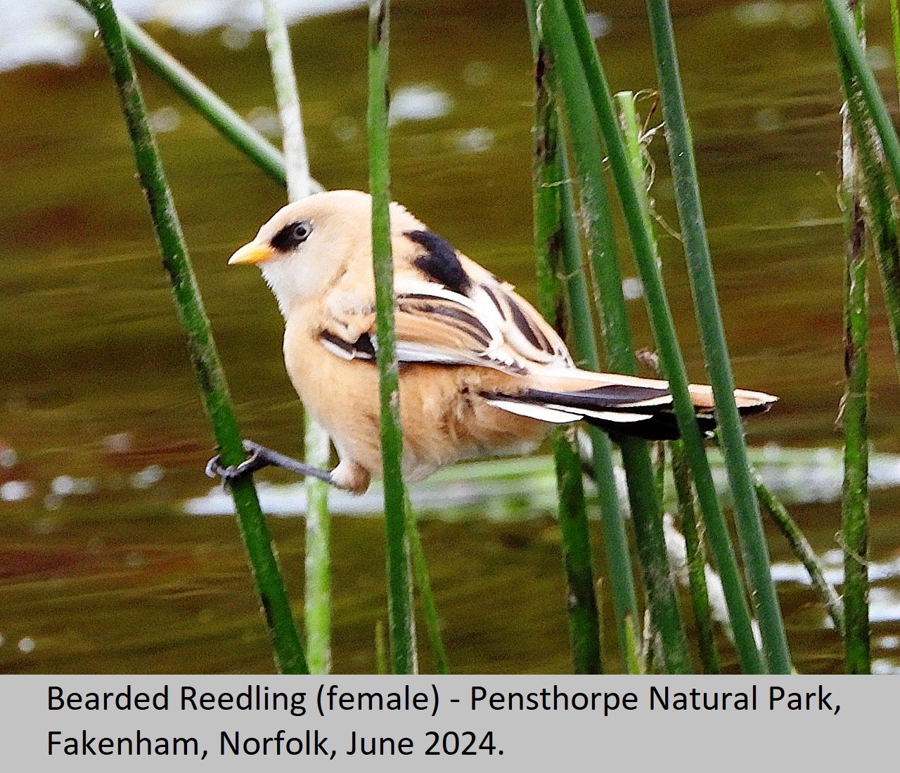 Bearded Reedling: UK Status: Resident, with about seven hundred breeding pairs in the UK. More can be seen in spring and autumn when some birds from Europe are migrating. Habitat: This bird inhabits extensive and mainly coastal reed beds during the breeding season, around the waters edge, as part of it's name suggests. Sometimes a few birds are spotted elsewhere during the late autumn, through to early spring. Breeding: Nests are placed well inside reed beds, quite low down and are interwoven with the reeds as support. They are constructed from reeds for the outer shell, the cup inside is lined with dry grasses. The normally lay four eggs, which are of an olive brown, with blackish brown blotches and squiggles, mainly toward the broader end. Comment: The Bearded Reedling is also known as the Bearded Tit, the male and female birds are sexually dimorphic, as you can see. They are not particularly common, at least partly due to the loss of wetlands over the last few decades. Most observers only get fleeting glimpses of these birds. They deep within the reed bed, perching on top of the reeds for mere seconds at time. They are a devil to photograph, as my pictures will confirm.