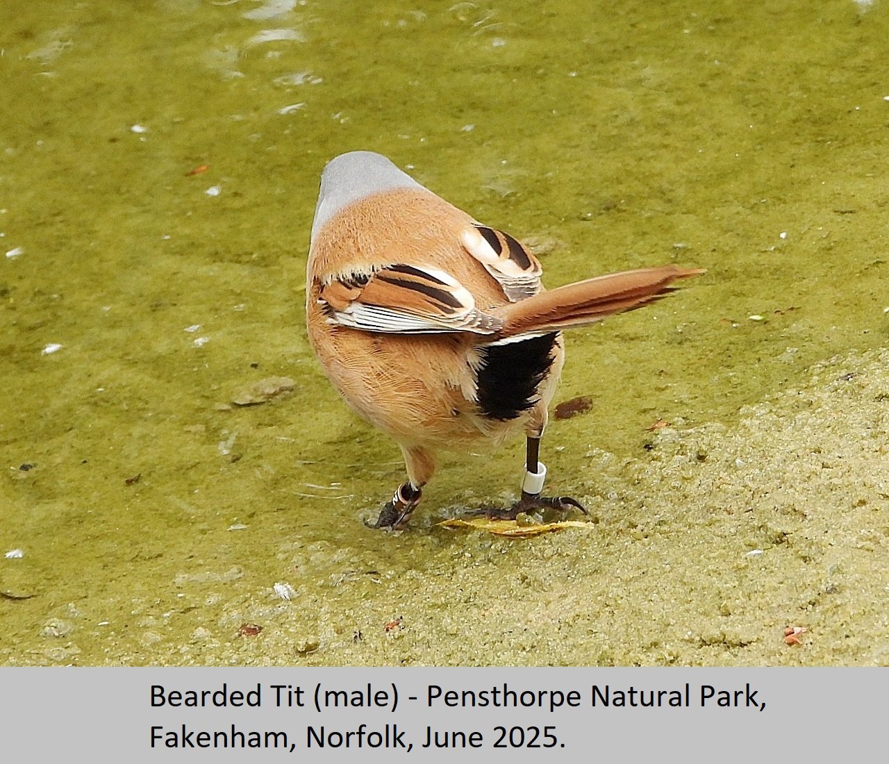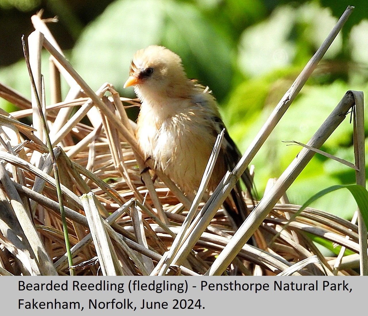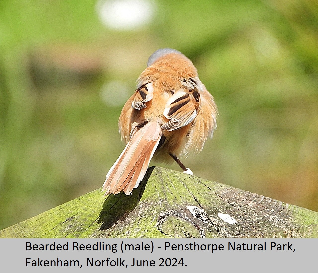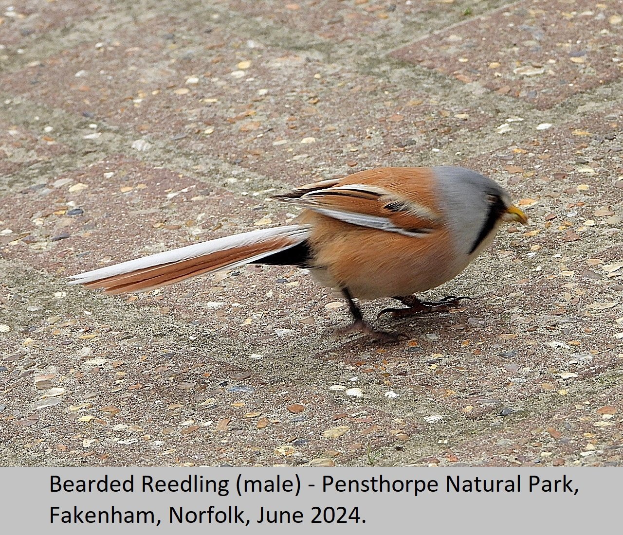 Bearded Reedling: UK Status: Resident, with about seven hundred breeding pairs in the UK. More can be seen in spring and autumn when some birds from Europe are migrating. Habitat: This bird inhabits extensive and mainly coastal reed beds during the breeding season, around the waters edge, as part of it's name suggests. Sometimes a few birds are spotted elsewhere during the late autumn, through to early spring. Breeding: Nests are placed well inside reed beds, quite low down and are interwoven with the reeds as support. They are constructed from reeds for the outer shell, the cup inside is lined with dry grasses. The normally lay four eggs, which are of an olive brown, with blackish brown blotches and squiggles, mainly toward the broader end. Comment: The Bearded Reedling is also known as the Bearded Tit, the male and female birds are sexually dimorphic, as you can see. They are not particularly common, at least partly due to the loss of wetlands over the last few decades. Most observers only get fleeting glimpses of these birds. They deep within the reed bed, perching on top of the reeds for mere seconds at time. They are a devil to photograph, as my pictures will confirm.