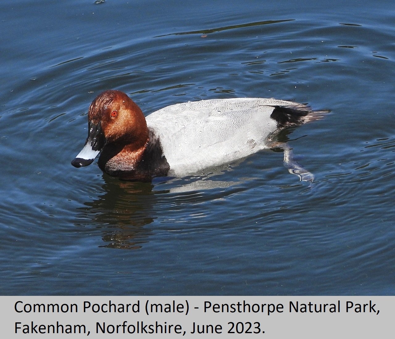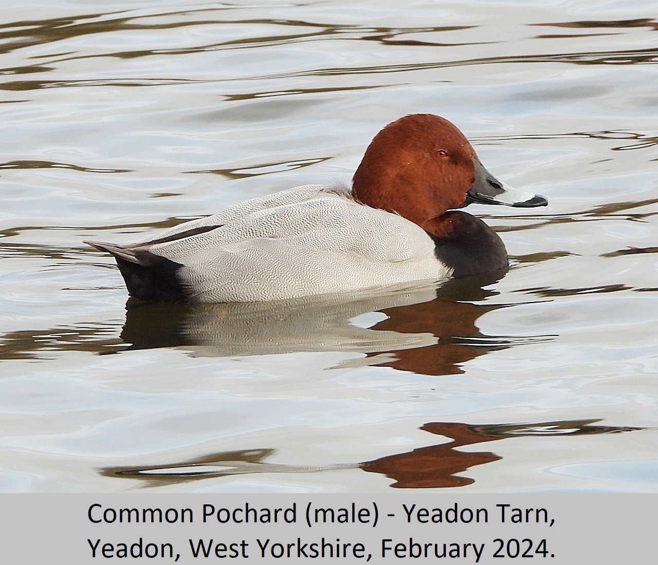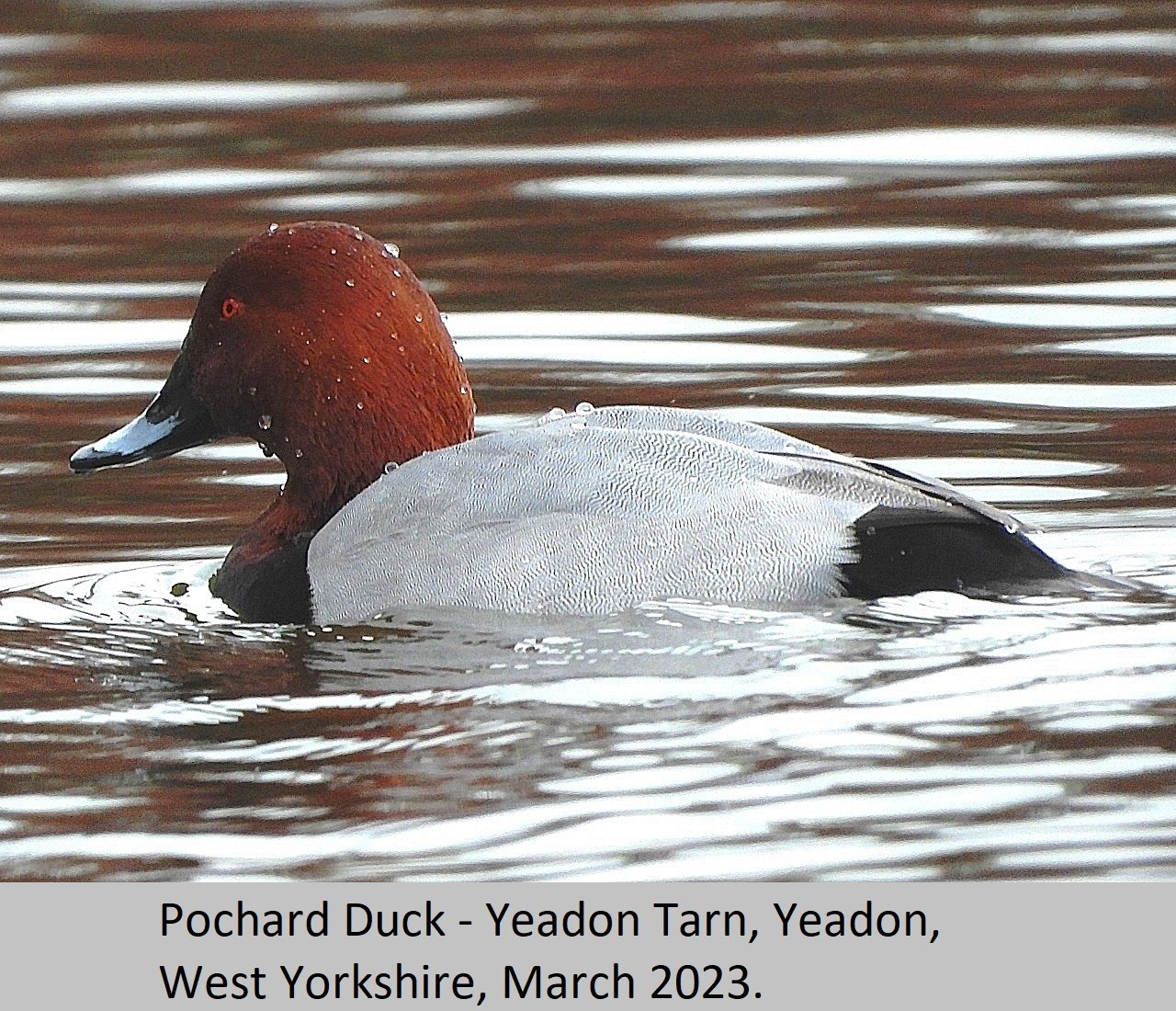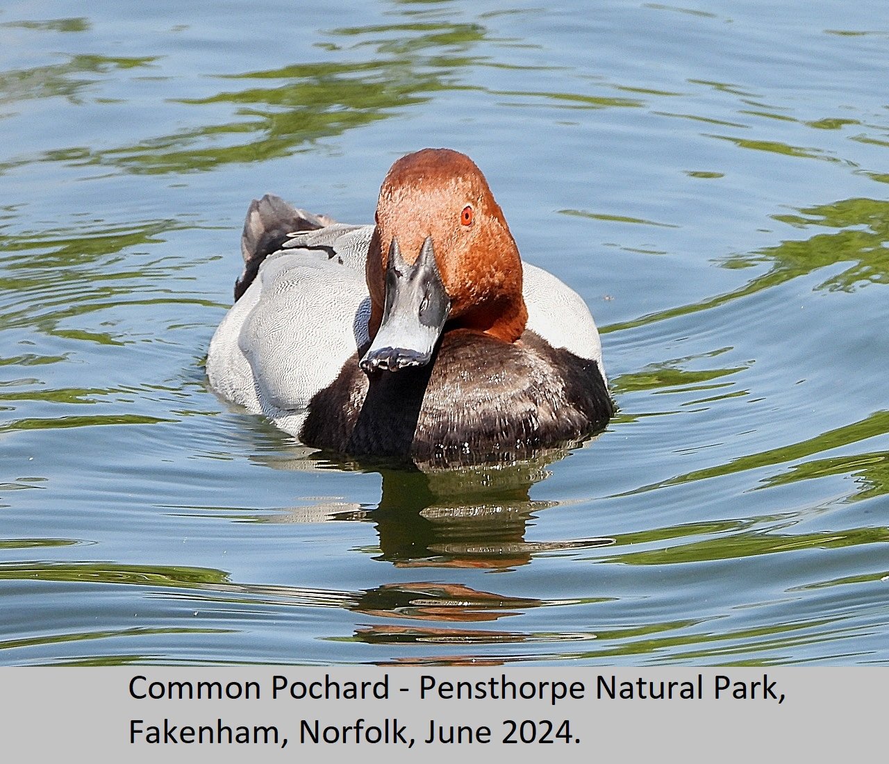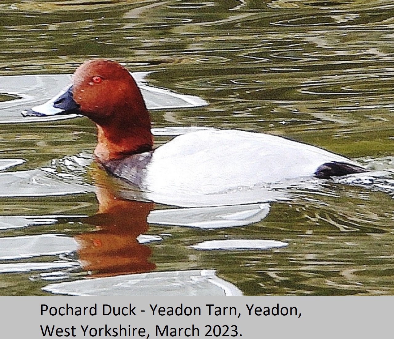 Pochard Duck: UK Status: Resident, the native population of about fifteen hundred birds swells greatly in the winter. Species coming here from the north to overwinter, numbers around twenty nine thousand mating pairs. Habitat: This duck is sexually dimorphic, the males are easily recognized, the females can be easily confused with females of other species. They like a wide range of habitats including mainly lowland rivers, canals, large pools and lakes, river estuaries and even inshore salt water. Breeding: Nests are situated on the ground close to water, sometimes on small islands, or even in shrubbery and reed beds suspended above the water. Nests are made of grasses and other vegetation, lined with downy breast feathers. There are eight to ten greyish green eggs in a clutch, and there is one, or sometimes two broods in a year. Comment: Common in winter throughout the UK, but more discriminating in the breeding season. Few area's in the UK are used for breeding, and are mainly on, or near the east coast.