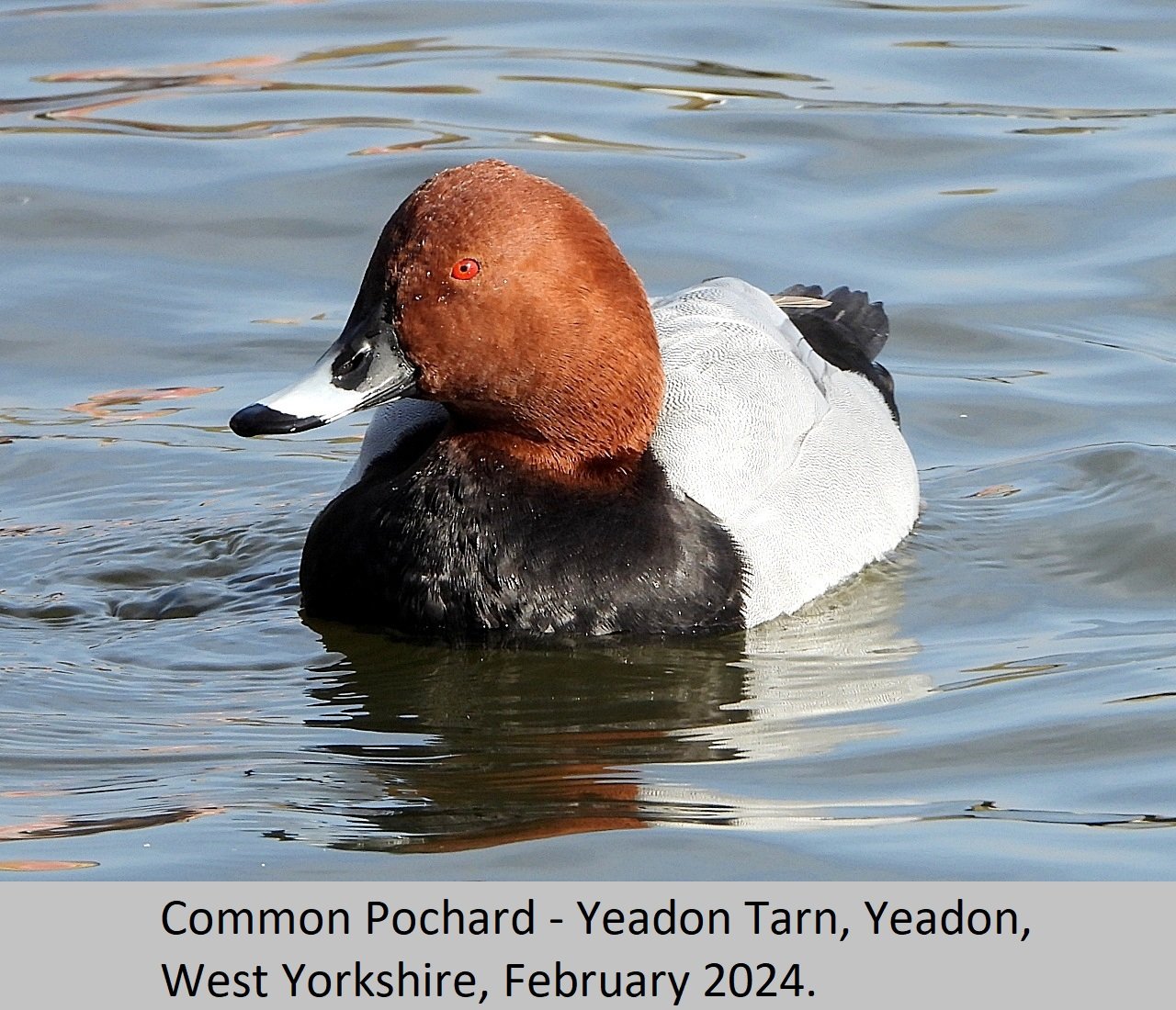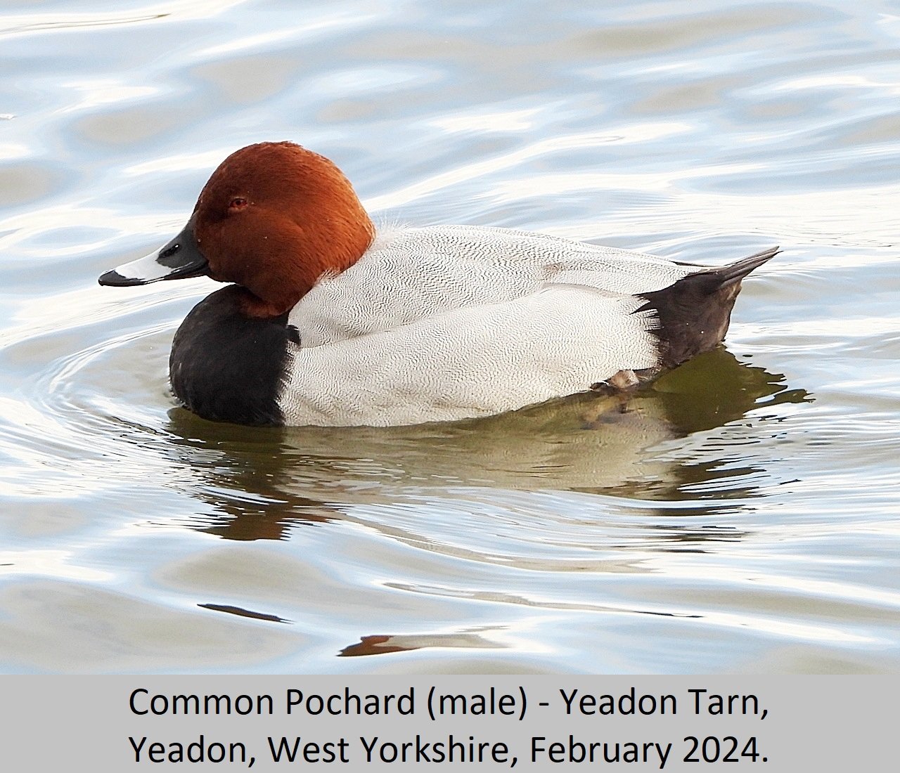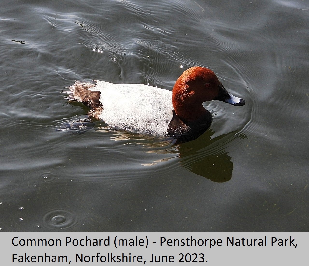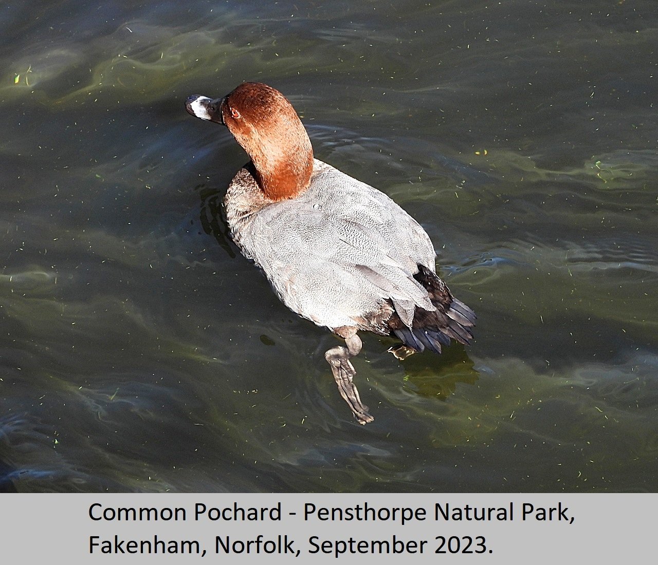 Pochard Duck: UK Status: Resident, the native population of about fifteen hundred birds swells greatly in the winter. Species coming here from the north to overwinter, numbers around twenty nine thousand mating pairs. Habitat: This duck is sexually dimorphic, the males are easily recognized, the females can be easily confused with females of other species. They like a wide range of habitats including mainly lowland rivers, canals, large pools and lakes, river estuaries and even inshore salt water. Breeding: Nests are situated on the ground close to water, sometimes on small islands, or even in shrubbery and reed beds suspended above the water. Nests are made of grasses and other vegetation, lined with downy breast feathers. There are eight to ten greyish green eggs in a clutch, and there is one, or sometimes two broods in a year. Comment: Common in winter throughout the UK, but more discriminating in the breeding season. Few area's in the UK are used for breeding, and are mainly on, or near the east coast.